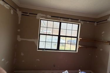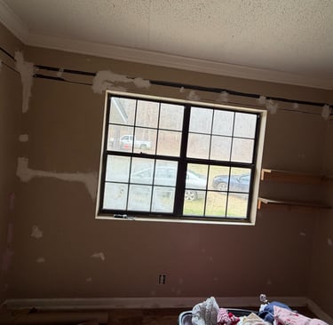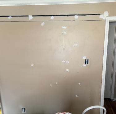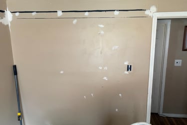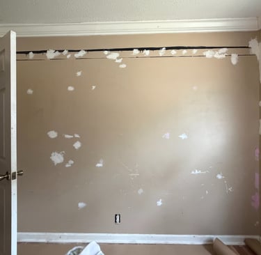 The walls had extensive patchwork, visible damage, and outdated paint that left the room feeling dull and unfinished.